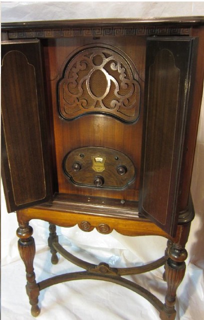Cabinet is Atwater Kent model AR1 walnut veneer with Birds Eye maple inside the doors. Finish is good on cabinet and fair on legs. Should be able to refinish easily